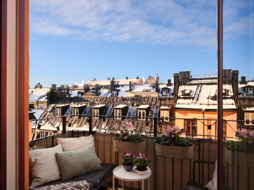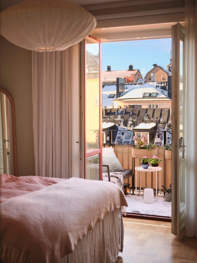 Das Schlafzimmer öffnet sich zu einem hofseitigen Balkon. Viel Sonne im Sommer, viel Ruhe das ganze Jahr. Die Einrichtung bleibt leicht: helle Stoffe, reduzierte Möbel, genug Platz zum Atmen. Auch hier wieder typisch skandinavisch: maßgefertigte Einbauten statt großer Schrankwände. Die bleiben beim Umzug immer in den Wohnungen, man braucht in Schweden selten Schränke mit umzuziehen, Stauraum gibt es oft viel.
