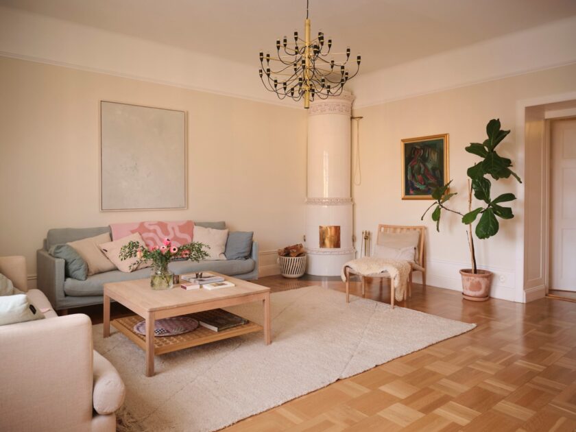 Im Wohnzimmer, das direkt neben der Küche liegt, wartet ein dekorativer Kachelofen. Ein echtes Highlight, das einfach so dasteht, weil er schon immer Teil des Alltags in vielen schwedischen Wohnungen ist – und hier sogar funktioniert. Das ist nicht immer der Fall, oft sind Kachelöfen so alt, dass man sie nicht mehr benutzen kann. Aber man lässt die Öfen trotzdem stehen, weil sie als Deko-Objekt sehr begehrt und geliebt sind. Die Möbel im Wohnzimmer wirken bewusst zurückhaltend. Kein visuelles Chaos, keine überladenen Deko-Arrangements. Stattdessen Textilien, Holz, matte Oberflächen – Materialien, die Wärme schaffen und Gemütlichkeit.