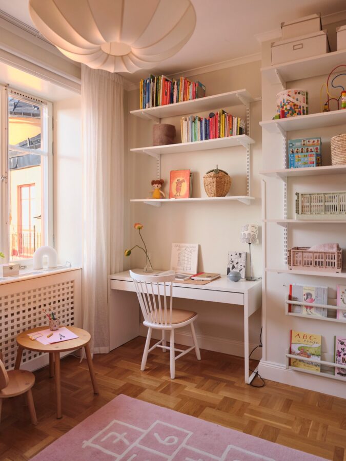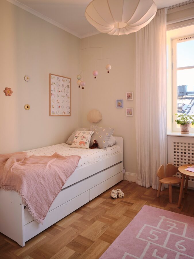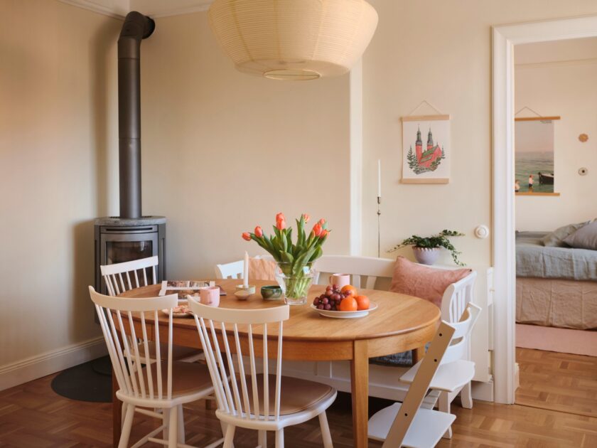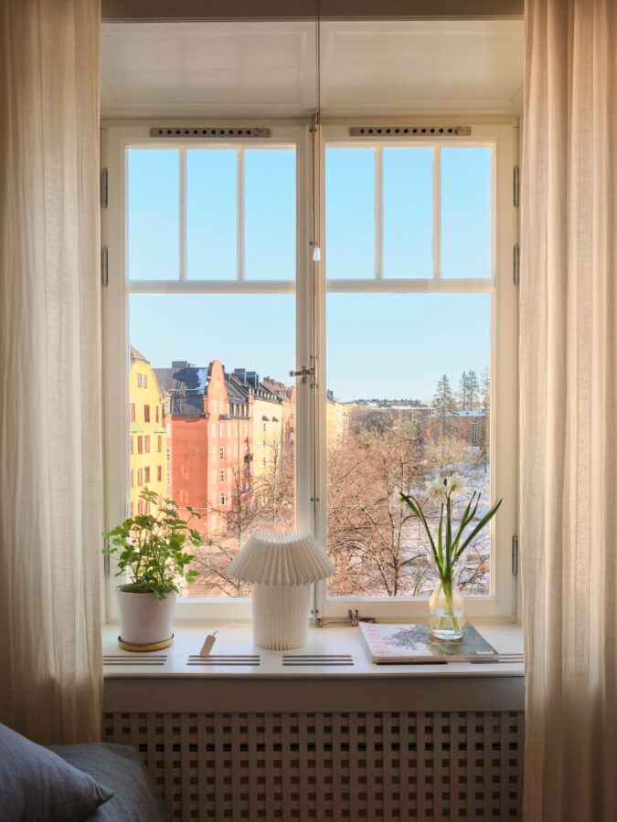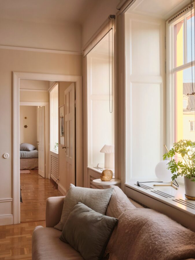 Kennst du diese Wohnungen, in denen man sofort bleiben will? Genau so fühlt sich dieser Altbau auf Södermalm an. Mit diesem feinen Gespür für Details, wie kleine Wanddeko-Elemente, fließend helle Vorhänge, die Heizungen verschwinden galant hinter Paneelen, Pastellrosa in allen Räumen… Alles wirkt so ruhig und entspannt – unter drei Meter hohen Decken.