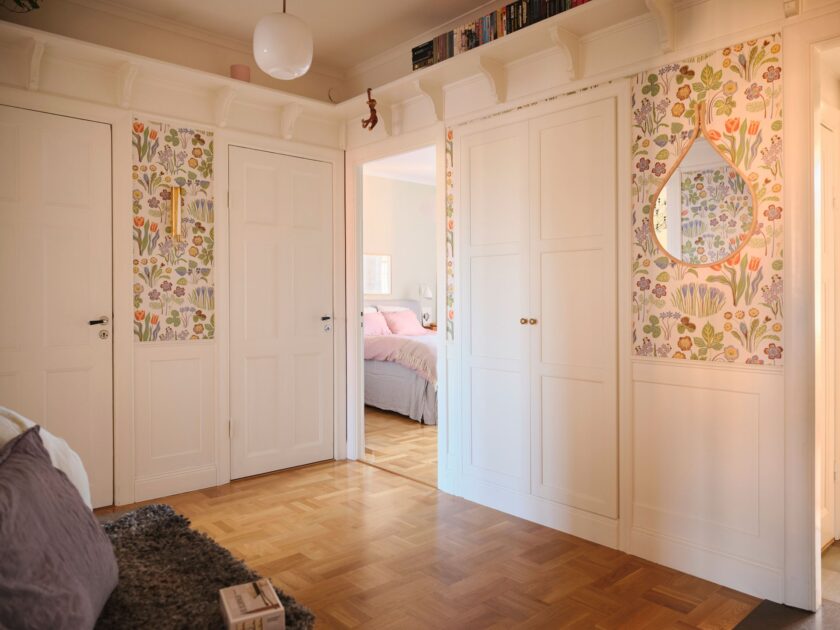 Das Highlight der Wohnung erwartet einen gleich im Eingangsbereich: Der Flur ist das vielleicht beste Stauraum-Wunder, mit so vielen Details, dass man schon genau hinsehen muss: Einbauschränke, die aussehen wir Türen zum nächsten Raum, praktische Haken, dekorative Paneele, maßgefertigte Schränke. Und wie genial ist bitte diese kleine Regalleiste unter der Decke, die einmal um den ganzen Flur herumläuft? Und dazu eine blumig gemusterte Tapete, die aus dem Durchgangs- einen Wohnraum macht. Stauraum wird nicht versteckt, sondern elegant integriert. Alles hat seinen Platz – und dadurch wirkt der Raum gleich viel ruhiger.