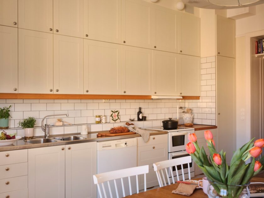 Wenn man sich einen Raum aussuchen müsste, in dem man den ganzen Abend bleibt, wäre es wahrscheinlich die Küche. Groß genug für lange Dinner mit Freunden, aber trotzdem intim. Der kleine, zweite Kamin sorgt für dieses typisch schwedische „mysig“-Gefühl – gemütlich, warm, aber ohne Kitsch. Die Küchenfronten sind klassisch gehalten, Oberschränke reichen bis zur Decke – wie viel Sachen da reinpassen! Auch, wenn man eine Leiter braucht, um an alles ranzukommen. Hier merkt man: Küche bedeutet in Schweden nicht nur Kochen, sondern Zusammenleben.